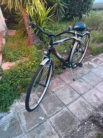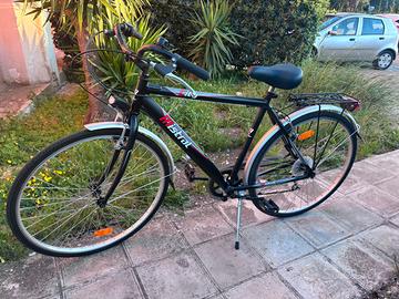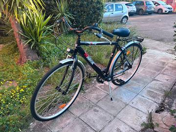 city bike/trekking base (marca “Mistral”), con telaio in acciaio o alluminio semplice, cambio posteriore entry-level, parafanghi e portapacchi nera satinata Usata pochissime volte