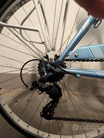 bicicletta da uomo in acciaio Legnano modello Portofino 28" azzurra, poco usata, come nuova, deragliatore SHIMANO Tourney TZ 500 6 v, comandi SHIMANO RS35 6S, manubrio acciaio nero, freni a V in alluminio, leva dei freni in alluminio, cerchi 28" alluminio, pneumatici 700x35 nero, copertura catena in acciaio.