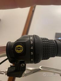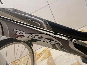 City bike donna, marca Delsante, telaio in alluminio in tonalità grigio-bianco, cerchi da 28, forcella rigida con guarnitura in alluminio 42 D, ruota libera Shimano TZ 60, 6 rapporti, comando cambio Shimano RS 66, cambio Shimano TY 21, manubrioin alluminio zoom, leve freno in resina/alluminio, freni V-Brake alluminio, cerchi in lega alluminio 6061 a 36 raggi, pneumatici 700 X 35 C Kenda neri, tubo sella in alluminio grigio, faretto anteriore e posteriore alimentato con dinamo, sella sportiva, chiusura di sicurezza con chiave. Inoltre, portapacchi posteriore con borse incluse, portapacchi anteriore con cestino a due comparti, cavalletto di stazionamento. Praticamente nuove (vedere pneumatici). Visionabile e ritirabile in zona Roma Talenti. Si valutano spedizioni, purché a carico dell’acquirente per costi ed organizzazione.