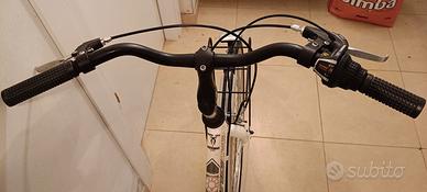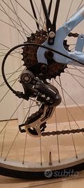 la bici e in ottime condizioni usata poco con piccolissimi graffietti quasi inesistenti ha le ruote da 29 pollici con copertoni da strada il telaio è di taglia s/m ha un deragliatore Shimano tourney tx mono corona e freni a pattino