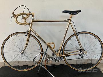 Bicicletta da corsa in acciaio prodotta dalla ditta Colnago con telaio completamente pantografato e dorato. Oggetto rarissimo adatta per essere esposta in ottime condizioni. Adatta per l’eroica con telaio in acciaio Columbus SL, taglia 61 XL-XXL misura orizzontale centro/centro cm 58; verticale centro/centro cm 61.Pinze freni; levefreni;mozzi;manettini;guarnitura;pedivelle;pedali;cambio;deragliatore Campagnolo;pipa e reggisella oro pantografata Campagnolo/Colnago. Cinghiette Colnago; puntapiedi dorati con pantografato il logo Colnago .Cerchi Mavic da 28 con tubolari Vittoria; Cambio con manettini a 2X6 velocità. Sella San Marco Colnago; nastro manubrio giallo/oro con tappi Colnago. Telaio finitura anodizzata placcata oro. Forcella pantografata e dorata Colnago Columbus. Vendita tra privati formula visto e piaciuto. Reso non previsto. Non scambio, se visualizzi l’annuncio l’oggetto è disponibile. Non smembro. Non conosco la storia dell’oggetto e non sono un esperto. Non desidero problemi se hai dei dubbi non acquistare la bicicletta, grazie. Oggetto da collezione da esporre in salotto, un vero gioiello . Piega manubrio Tornado in lega speciale d'alluminio superleggero incorruttibile placcato oro 24k. Movimento centrale pantografato, porta borraccia dorato. Posso inviare altre foto, tipo Colnago Mexico Oro. PER LA SPEDIZIONE MI OCCORRONO CIRCA 10 GIORNI PER PROCURARMI GLI IMBALLI E ORGANIZZARE IL CORRIERE. Oggetto senza garanzia. Non è presente il manuale d'uso, certificati e documenti. Peso complessivo circa 10 kg con pedali. Dovrebbe trattarsi del modello Superissimo anni 80 Le informazioni sono puramente indicative e non vincolanti