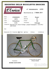 Colnago Super 1974, conservata in ottimo stato - registrata nel registro delle biciclette Eroiche - misura telaio 55 - Manubrio 3ttt - attacco Colnago - gruppo Campagnolo Pat 74 - cerchi Nisi - Sella Cinelli originale in ottimo stato - guarnitura pantografata Colnago