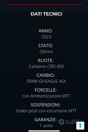DATI TECNICI ANNO: 2023 STATO: Ottimo RUOTE: Carbonio CRD 400 CAMBIO elettrico SRAM GX EAGLE ASX FORCELLE: con Ammortizzatore MTT SOSPENSIONI: Foderi post con escursione MTT