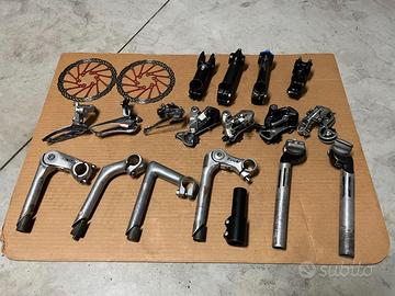 Vendo intero lotto oppure a singoli pezzi vari componenti / ricambi bici da corsa e MTB. Se interessati chiedetemi qualsiasi cosa. PREZZI BASSI! Se presi in blocco faccio un gran bel prezzo!!! Di seguito quello che ricordo: -Guarnitura Campagnolo (con relative viti di serraggio) -Pedali da corsa in carbonio -Cassetta vintage 5v -Cassetta Shimano NUOVA 10v (con scatola) -Lucchetti vari -Leve freno -Dischi freno TEKTRO rossi -Varie pipe manubrio (anche quelle regolabili) -Vari attacchi manubrio (Bontrager,ITM,ecc..) -Cambio Shimano Revoshift 6v -Cambi Shimano Deore XT 3x9 -Selle (Ergonomica,Velo,Selle Royal) -Borraccia vintage BIANCHI .Borsello vintage marrone in camoscio -Pinze freno vintage eroica -Vari cavalletti metallo -Deragliatori anteriori Shimano a 2 o 3 velocità. Uno è Shimano "a saldare" quindi senza collarino NUOVO. -Deragliatori posteriori, Shimano vintage, Shimano 105 10v, Campagnolo Veloce 8v -Pedali Neri flat MTB Non spedisco!!!