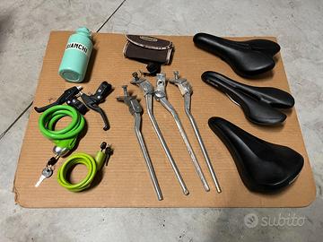 Vendo intero lotto oppure a singoli pezzi vari componenti / ricambi bici da corsa e MTB. Se interessati chiedetemi qualsiasi cosa. PREZZI BASSI! Se presi in blocco faccio un gran bel prezzo!!! Di seguito quello che ricordo: -Guarnitura Campagnolo (con relative viti di serraggio) -Pedali da corsa in carbonio -Cassetta vintage 5v -Cassetta Shimano NUOVA 10v (con scatola) -Lucchetti vari -Leve freno -Dischi freno TEKTRO rossi -Varie pipe manubrio (anche quelle regolabili) -Vari attacchi manubrio (Bontrager,ITM,ecc..) -Cambio Shimano Revoshift 6v -Cambi Shimano Deore XT 3x9 -Selle (Ergonomica,Velo,Selle Royal) -Borraccia vintage BIANCHI .Borsello vintage marrone in camoscio -Pinze freno vintage eroica -Vari cavalletti metallo -Deragliatori anteriori Shimano a 2 o 3 velocità. Uno è Shimano "a saldare" quindi senza collarino NUOVO. -Deragliatori posteriori, Shimano vintage, Shimano 105 10v, Campagnolo Veloce 8v -Pedali Neri flat MTB Non spedisco!!!