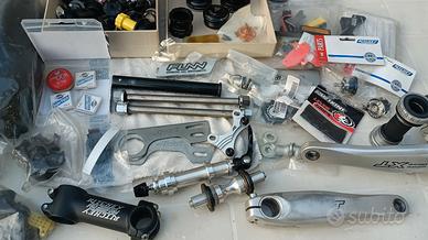 vendo blocco di componentistica MTB. A parte qualche particolare nuovo ancora blisterato, il resto è usato, quindi acquistate quello che vedete in foto. A grandi linee ci sono due coppie di pedali flat, un paio di pedivelle Shimano XT octalink, sella FUNN mimetica, vari deragliatori anteriori, attacchi manubrio XC, serie sterzo 1"1/8 tra cui una Woodman da FR, assi ruota passanti e altri componenti vari..
