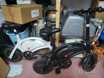 Coppia bici piegevoli DYU D2 45Km di autonomia per 25Km max velocita, pedalata assistita 3 livelli e accelleratore, freni a disco, luci integrate, cavalletto, pneumatici 12 pollici, caricabatterie. Peso 15Kg. Molto divertenti e ultra compatte possono essere caricate facilmente in auto, metro, camper, roulotte. Hanno normali segni di usura ma sono perfettamente funzionanti. La nera ha percorso 309Km, la bianca 223Km. Le bici sono rimaste inutilizzate per molto tempo ed a Giugno 2025 entrambe le batterie a causa dell'inutilizzo prolungato sono state sostituite presso centro assistenza ufficiale (con scontrino) e da allora sono rimaste ferme in garage. Vendo preferibilmente in coppia. Cad. € 250 Coppia € 450. Visionabili a Roma in zona Roma Primaporta. Solo ritiro di persona, no spedizione.
