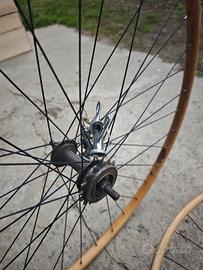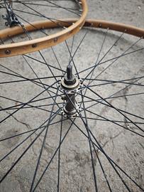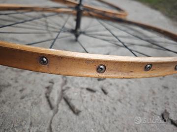 Vendo coppia di cerchi per bicicletta con canale in legno marca Clement, ideali per bici d’epoca o da restauro vintage.