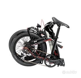 Ottima per chi cerca praticità e performance da ebike. Freni a disco meccanico Tektro, cambio Shimano a 6 velocità, motore Bafang da 250W, batteria estraibile da 470Wh. Telaio pieghevole in alluminio, una volta chiusa rimane veramente compatta ed occupa pochissimo spazio. Facile da trasportare è ottima per chi vuole portarle con sé in vacanza, in camper, campeggio, o per gite. Forcella ammortizzata Zoom, gomme in ottime condizioni, pastiglie dei freni nuove. Dotate di impianto di luci anteriori e posteriori, campanello, catarifrangenti e specchietto.