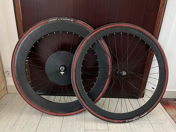 Vendo coppia di ruote fixed, single speed in ottime condizioni. Hanno rispetitvamente profilo da 40 e 70mm. Le vendo conplete di: Compertoni michelin lithion.2 700x25c (uasti poco). Camere d’aria decathlon. Tendi catena. Cover parziale lenticolare (rimovibile). Pignone 18 denti in piu regalo un’altro pignone da 11 denti. Possibilita di spedizione. Per qualsiasi info contattatemi.