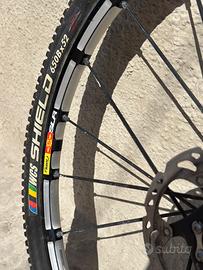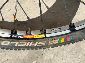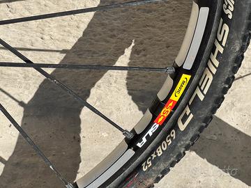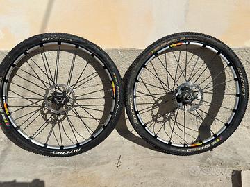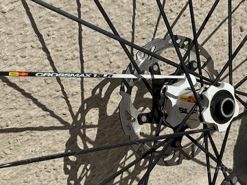 Coppia di ruote MAVIC Crossmax SLR 27.5 pollici, per MTB, un modello di alta gamma progettato per il Cross Country (XC). In particolare, il design con ampie sezioni fresate tra i raggi e la finitura nera con scritte bianche indica che si tratta di una versione prodotta tra il 2012 e il 2014, note per la loro leggerezza e reattività. Specifiche Tecniche Diametro: 27,5 pollici / 650b. Peso stimato: Circa 740 - 755 grammi per la sola ruota anteriore. Tecnologie: Sistema UST (Universal Standard for Tubeless) per l'uso senza camera d'aria e foratura Fore che mantiene il ponte superiore del cerchio integro. Compatibilità: La ruota nell'immagine monta un mozzo per forcelle Lefty (tipiche delle biciclette Cannondale) e un disco freno con attacco a 6 fori. Pneumatici in regalo.