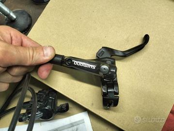 Vendo coppia freni a disco SHIMANO DEORE SBR-M615 anteriore e posteriore. Li avevo cambiati per capriccio poco dopo aver comprato la bici. Completi di pastiglie. Nessun segno di caduta o graffi come visibile in foto.