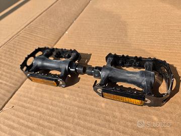 "Vendo coppia di pedali standard, universali, ideali come ricambio per city bike, bici da trekking o mountain bike. Hanno un corpo centrale in robusta resina e una gabbia esterna in metallo con profilo dentato per garantire una buona presa con le normali scarpe da ginnastica. Completi di catarifrangenti laterali per la sicurezza stradale. Filettatura universale (9/16""), pronti da montare. Solidi e senza fronzoli. #citybike #trekking #mtb #ricambibici #ciclismo #btwin #decathlon #rockrider #pedaliflat"