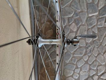 Come da foto ruote 28 con Copertoncini Michelin Dynamic Sport 700x23, mozzi e sganci rapidi di diverso tipo Campagnolo vintage, cerchi in alluminio Nisi, raggi inox.