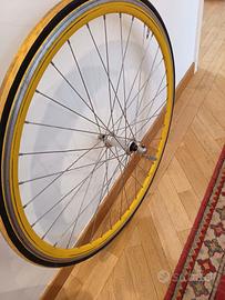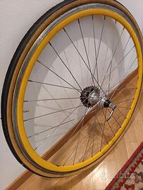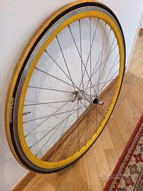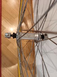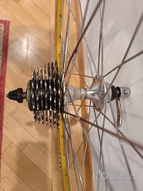 Vendo coppia ruote bici corsa o touring, con cerchi a medio profilo (30 mm) per copertoncini. Buona scorrevolezza, dritte. Mozzo posteriore Miche con pacco pignoni a 7 Velocità. Possibile spedizione in tutta Italia