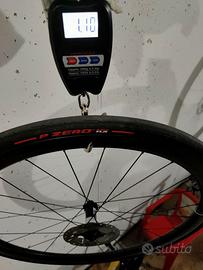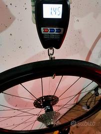 Coppia di ruote in carbonio ultraleggere custom, altezza 38mm,mozzo DT Swiss 350, raggi in acciaio sapim cx ray,cerchi latticizzabili infatti questi in foto sono tubeless, vendo solo i cerchi senza pacco pignoni e senza dischi. Solo a titolo informativo : i cerchi completi di dischi e pacco pignoni ultegra e gommati pesano 1100 grammi l'anteriore e 1450 grammi il posteriore ,