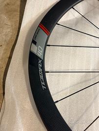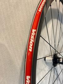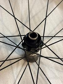 COPPIA DI RUOTE CARBON VISION TRIMAX 40 CSI DISC AEREODINAMICHE E AFFIDABILI Le Vision TriMax Carbon 40 CSI Disc sono ruote con cerchio in carbonio tubeless ready per freno a disco, adatte a strada e gravel leggero, ideali per chi è alla ricerca di elevate prestazioni aerodinamiche sui percorsi pianeggianti e misti. Grazie all’esclusiva costruzione del cerchio CSI (Carbon Structural Integration), il carbonio si integra alla struttura portante e resistente in alluminio, migliorando l’estetica della ruota senza compromettere le prestazioni. Altezza del profilo del cerchio: 40 mm. Canale interno: 19 mm Raggi piatti con profilo aero: 21 sulla ruota anteriore e 24 su quella posteriore. Corpetto Shimano e attacco CenterLock Perno passante Nastro già installato Peso : KG.1,750 Le ruote sono usate, ma in perfetto stato (nessuna caduta o incidente), senza segni. Preferisco la consegna a mano a Milano (zona Navigli), ma la spedizione è comunque disponibile.