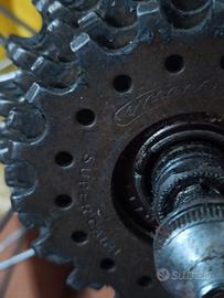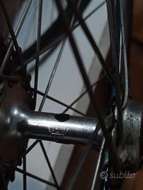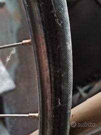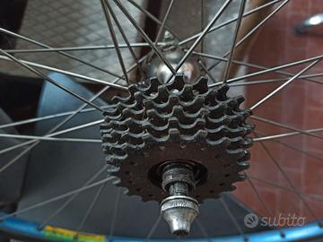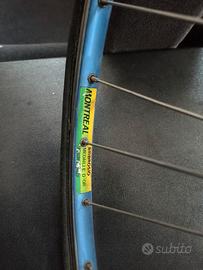 Coppia di ruote d'epoca per tubolari, cerchi Ambrosio Medaille d'or azzurri, mozzi Miche, ruota libera Super Caimi Everest 6 velocità, il tubolare mostra qualche segno di usura. Preferisco ritiro a mano, zona MM Udine
