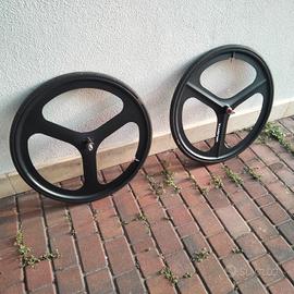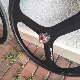 vendo coppia ruote per bici fixed/single speed in lega di magnesio a 3 razze per copertoncino, mozzo posteriore flip flop, pignone fisso 17 denti