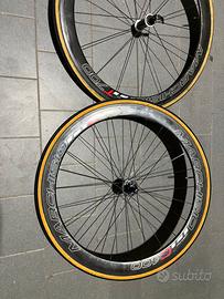 coppia di ruote marchisio full carbon comprese di tubolari,corpo ruota libera,comparibile shimano,profilo 50 mm