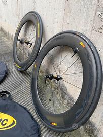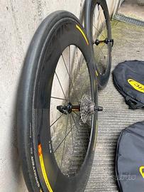 Vendo coppia ruote Mavic Cosmic Full Carbon per tubolare, profilo 80mm, anno 2018, usate solo in gara (triathlon lungo), pneumatici tubolari Continental usati pochissimo
