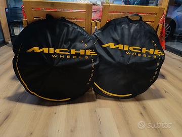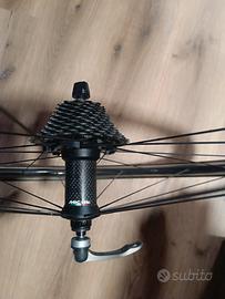 coppia di ruote da ciclismo Miche Supertype 338 in carbonio. Sono nuove, mai utilizzate , complete di tubolari nuovi mai utilizzati ,monta coperto Shimano Sram compreso pacco pignoni Shimano dura ace 11 Speed e sacchi porta ruote originali