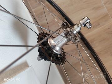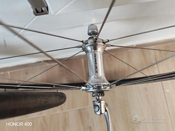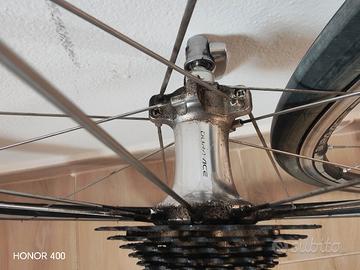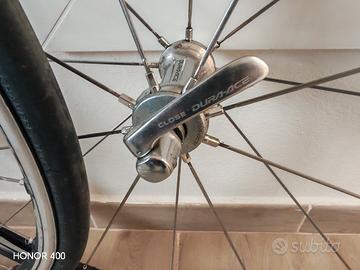 coppia di ruote Shimano Durace 10 velocità Wh 7801 usate in ottime condizioni con copertura e pacco pignone incluso centrate e scorrevolissime solo da ripulire erano su colnago