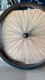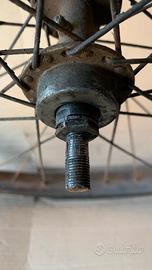 Come da foto vendo coppia ruote R 28 , molto vecchie ma ancora recuperabili, mozzo posteriore con ingrassatore ma con perno da sostituire perché rovinata la filettatura, mozzo anteriore marchiata bianchi corsivo.