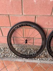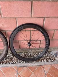Vendo per inutilizzo splendida coppia di ruote Vision TC50 in carbonio da 28” ad alto profilo (50mm). Caratteristiche Tecniche: • Materiale: Carbonio ad alta resistenza. • Profilo: 50mm • Corpetto: Shimano 11 velocità (già installato). • Sistema: Per tubolare (Palmer). • Frenata: Pista frenante per freni a pattino (Rim Brake). • Mozzi: Vision originali, scorrevoli e robusti. Le ruote sono usate ma in buone condizioni generali. Non presentano crepe, botte o difetti strutturali. La pista frenante è ancora in ottimo stato. I palmer sono inclusi e già montati, pronti per essere utilizzati. Ritiro a mano a Pavia e zone limitrofe