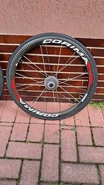 Cerchi per bici da corsa Corima Areo S, taglia 28, in ottime condizioni. Sono tubolari, hanno la pista frenante in carbonio e cuscinetti in ceramica ed il profilo è 42 mm. Hanno un pacco pignoni da 11 velocità, attualmente montano su un pacco pignoni scimano. Corredate con pattini in sughero