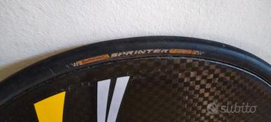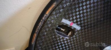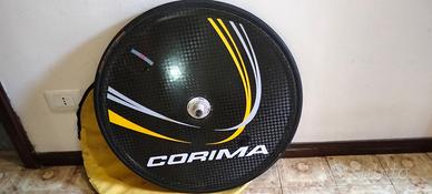 Ruota a disco Corima rim brake tubolare Continental Sprinter 23mm, su nastro Tufo. Ruota libera Campagnolo, borsa compresa.