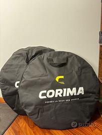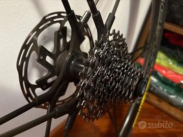 Le ruote sono comprese di borse Corima originali, dischi freno Sram Red Paceline 160 mm nuovi, pacco pignoni Sram Force 12 velocità 10-30 semi nuovo, pneumatici tubolari Tufo Hi composite Carbon 25 mm nuovi (non sono quelli in foto).