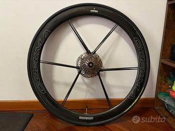 Vendo Ruote Corima MCC Evo 47 (disco) TUBOLARI (acquistate febbraio 2024, utilizzate per Km 5700) praticamente nuove. Completamente in carbonio, peso dichiarato per la coppia 1360 g, cuscinetti originali standard, non ceramici (E' installato il corpetto ruota libera XDR Sram 12 velocità ma consegno anche corpetto ruota libera Shimano 12 velocità).