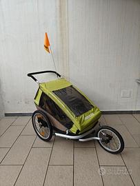 Croozer Kid for 2 ClickCrooze, usato poco e in ottime condizioni. È un rimorchio che abbiamo scelto per la qualità costruttiva Croozer, uno dei marchi più affidabili e riconosciuti nel settore, soprattutto quando si parla di sicurezza dei bambini. Telaio robusto e stabile, baricentro basso, cinture di sicurezza a 5 punti, materiali curati e grande attenzione alla visibilità su strada. All’interno lo spazio è abbondante e ben ventilato, pensato per trasportare due bambini in totale tranquillità. Nel retro dispone di un ampio bagagliaio per riporre tutto il necessario per i bambini. Ottima soluzione anche nel caso i bambini ci si addormentassero dentro. Possono stare comodi e al riparo. Il carrello dispone di bandierina di segnalazione e catarifrangenti anteriori e posteriori per viaggiare in strada in sicurezza, Col ruotino in dotazione può essere utilizzato anche come passeggino, oltre al classico utilizzo come rimorchio bici. Incluso anche il kit jogging, per passeggiate nel parco o fondo sconnesso. In dotazione due attacchi per bicicletta, comodi se si usano più bici. Un prodotto solido, affidabile, progettato per durare nel tempo e con un’ottima rivendibilità. Caratteristiche: Per 2 bambini Cinture di sicurezza a 5 punti Telaio stabile e sicuro Utilizzabile come rimorchio bici Utilizzabile come passeggino con ruotino anteriore Kit jogging incluso 2 attacchi bici inclusi Copertura anti pioggia Usato poco, ottime condizioni Dal sito: altezza massima spalle: 31 cm (per ogni posto a sedere) altezza testa: 63 cm lunghezza, larghezza, altezza (senza maniglione): 108 x 87 x 89 cm lunghezza, larghezza, altezza ripiegato (senza maniglione e ruote): 107 x 86 x 29 cm altezza maniglione (min/max): 100/113 cm carico ammissibile: 45 kg Ritiro a mano preferito. Spedizione valutabile.