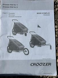 Vendo Croozer dotato di tutti i suoi accessori in buone condizioni e senza difetti rilevanti se non qualche segno di usura. Capotte impermiabile e zanzariera , braccio per bicicletta con kit di aggancio. Ruota grande e ruota piccole per modalita passseggino . Perfetto anche in montagna sulla neve .