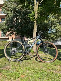 Cube reaction c:62 pro •Tipo: MTB hardtail cross-country in carbonio •Telaio: Carbonio C:62® Monocoque, cavi interni, predisposizione dropper, Boost 12×148 •Forcella: RockShox Judy Gold RL Air, 100 mm, lockout OneLoc Trasmissione (1×12 Shimano): •Shifter Deore M6100 •Deragliatore post. XT M8100 •Guarnitura MT611, 32T •Cassetta 10–51 •Catena M6100 Freni: Shimano XT idraulici — 180 mm ant. / 160 mm post. Ruote & gomme: •Cerchi Answer Atac AM, tubeless ready •Schwalbe Racing Ray / Racing Ralph 29×2.25 Componenti: •Manubrio 720 mm •Attacco SLX 31.8 •Reggisella 27.2 •Sella Natural Fit Venec •Manopole ACID React Pro Geometria: taglia M, impostazione XC (posizione sportiva ma stabile) Peso: ~11,5 kg senza pedali Stato: molto buono, minimi segni Uso: ~500 km reali Prezzo: trattabile