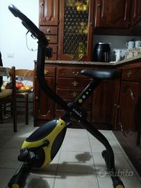Cyclette Diadora smarty. Pieghevole, richiudibile, ottima per chi ha problemi di spazio. Leggera, pesa appena 17kg. Il display indica le calorie bruciate, la distanza percorsa, il tempo trascorso, la velocità e i battiti cardiaci, monitorabili tramite i sensori palmari hand pulse posti sul manubrio.