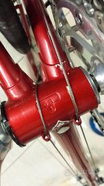 - Materiale telaio: Acciaio Columbus Cr.Mo. cycles SLX con rinforzi elicoidali, congiunzioni saldate a mano nella storica bottega di Ugo De Rosa.