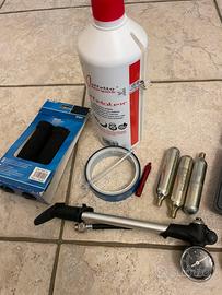 accessori bici mtb per mancato utilizzo.POMPA PER FORCELLE-DINAMOMETRICA per serraggi-KIT BRUGOLE e CHIAVI portatili _FLACONE LATTICE-FASCE per LATTICE-MANOPOLE-ESTRATTORE VALVOLE—numero 3 KIT CARTUCCE co2-FARO a led da Bici