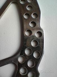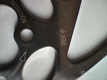 Per passaggio a disco da 200mm all'anteriore, vendo disco da 180 Shimano SM-RT56 pressoché nuovo. 6 fori. Penso che avrà percorso (forse) 30 km in piano, dunque no scaldate o usura di sorta. Le foto in macro della pista frenante sono chiare.