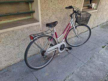 Elegante bicicletta donna raggio 28 in ottime condizioni, cambio 18 rapporti ben funzionanti, con ampio cestino nuovo, portapacchi, cavalletto, campanello, luce LED, sella imbottita, freni e gomme ottimi, pronta all'uso. la bici è davvero in ordine leggera e maneggevole da guidare, ideale per città e passeggiate, si trova a castelmaggiore, facilmente raggiungibile in treno da Bologna e ritorno dove puoi caricare anche la bici.