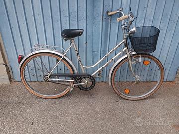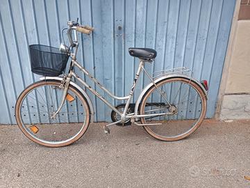 Elegante bicicletta donna raggio 26 in ottime condizioni, cambio 3 rapporti ben funzionanti, con cestino, doppio portapacchi, campanello, luce, sella imbottita gomme ottime e freni classico anteriore e contropedale posteriore ottimi, pronta all'uso. la bici funziona davvero bene, leggera e maneggevole da guidare, pedalata morbida, ideale per città e passeggiate.