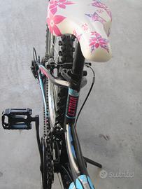 Doublezz Violet 24" mountain bike dai 10 ai 12 anni. Telaio e forcella in acciaio. Trasmissione Shimano 6x3, freni V-Brake in alluminio, ruote in alluminio da 24×1,90 con coperture MTB. Usata pochissimo, condizioni eccellenti