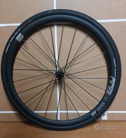 vendo coppia di cerchi dt swiss E 1800 in alluminio usati ma in buono stato già nastrati tubless, vendo con copertoni vittoria rubino pro tlr da 30 mm l'anteriore però montato con camera d'aria perché tempo fa ho pizzicato il copertone. I cerchi cmq sono perfetti unico neo uno presenta un alone che non riesco a mandare via, vendo per passaggio a cerchi di sezione più larga.