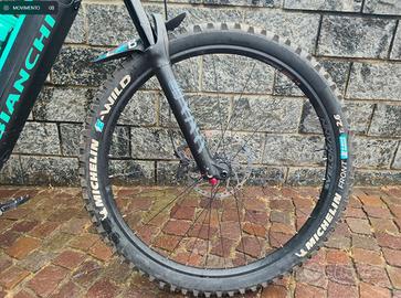 Vendo E-bike Bianchi FX TYPE PRO in CARBONIO - taglia L acquistata a luglio 2025 (ancora più di un anno di garanzia) con meno di 1000 km. Ho sia i copertoni originali (usati per circa 600 km),sia quelli visibili in foto Michelin E-Wild con tubeless e salsicciotto sul retro. Bici usata 50% su strada e 50% su sterrato, OTTIME CONDIZIONI! UNITÀ MOTORE: MOTORE Shimano EP8, 250W, 85Nm, Display SC-EM800 BATTERIA Batteria integrata 630Wh TELAIO: KIT TELAIO T-Tronik FX-Type Pro carbonio dimensioni. Forcellini passanti 12×148 mm – Freno a disco 180 post mount – 150 mm di escursione anteriore e posteriore – Passaggio interno dei cavi in DT FORCELLA RockShox YARI RC 29″, escursione 150 mm, HT conico 1,5, asse Maxle Stealth 15×110 mm BOOST, rotore minimo 180 mm, rotore massimo 220 mm, rake 42 mm, corona 59 mm AMMORTIZZATORE POSTERIORE Fox Float DPS Performance, LV, EVOL, leva a 3 posizioni SERIE STERZO FSA NO.77R 1.5″ TRASMISSIONE: COMANDIShimano Deore SL-M6100, 12v CAMBIO Shimano Deore XT RD-M8100, 12v GUARNITURA Shimano FC-EM600, 165MM Shimano Chainring SM-CRE80-12-B, 34T CATENA Shimano, CN-M6100 FRENI: FRENI Shimano, BL-M6100, BR-M6120, 4 pistoncini DISCHI Shimano SM-RT64, RT-EM600, L 203MM RUOTE: RUOTE ‘Shimano, BL-M6100, BR-M6120, 4 pistoncini MOZZO POSTERIORE Shimano FH-MT510-B, for Center Lock, 32h, 12×148 TA MOZZO ANTERIORE Formula CL-811 for Center Lock, 32h 15x110mm T ATTACCO MANUBRIO: Velomann +/-0°, 1,1/8 x diam.35mm, 50mm PIEGA Velomann larghezza 780mm, diam.35mm, rise 20mm, backsweep 9° NASTRO/MANOPOLE T-One Rock T-GP34 SELLA REGGISELLA JD, diam.31,6mm, passaggio cavi interno remoto 150 m di escursione Ho aggiunto Pedali Campabros Kombat IX - PEDALI MTB UTILIZZO ENDURO, FREERIDE, DOWNHILL. - Materiale Alluminio con perni sostituibili e asse in Cr-Mo - Dimensione: 97 x 97 x 17 mm - Peso: 346 gr