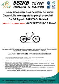 EBIKE Haibike AllTrail 8 LOW Bosch 100Nm BATTERIA 600wh Taglia S Disponibile per gli associati EBIKE TEAM NATURA E SAPORI TAGLIA S-M-L-XL con maggiorazione di 400 euro. Cerchi una E-MTB facile da gestire, stabile e confortevole su qualsiasi tipo di percorso? La Haibike AllTrail 8 è la scelta ideale per chi vuole affrontare pendenze e sentieri misti con autonomia fino a 110 km. Bici venduta in condizioni pari al nuovo, bici test ufficiale con pochi km e garanzia attiva dal momento dell’acquisto. CATEGORIA BICI MTB-ALL = BICI FULL CON AMMORTIZZATORI ANTERIORI 130/160MM E POSTERIORI 160/230MM ADATTE PER USO SU ASFALTO STERRATO E SINGLE TRACK DIFFICOLTA’ S0/S1/S2 CON SELLA TELESCOPICA, E MOTORE SUI PEDALI. CARATTERISTICHE PRINCIPALI Motore Bosch Performance Line CX 5ª generazione – 100 Nm Batteria Bosch PowerTube 600 Wh Computer Bosch LED Remote con 4 livelli di assistenza manuali e gestione automatica Forcella RockShox Psylo Silver RC – Crown Adjust, Solo Air, escursione 140 mm, stelo 35 mm Ammortizzatore RockShox Deluxe Select – 205x65 mm, Trunnion, DebonAir+ Cambio Shimano CUES RD-U6000 – 11 rapporti, pacco pignoni 10-50 Freni TRP Slate EVO HD-M807 – 4 pistoncini, dischi 203 mm Ruote mullet 29"/27,5" per miglior controllo e agilità Reggisella telescopico con comando ergonomico al manubrio Sella Selle Royal Vivo – massimo comfort e funzionalità Taglia S – ideale per altezze 155-170 DOVE PROVARLA - Nei Tour Test ufficiali, presso i Campi Scuola E-Bike Team Roma sulla Appia Antica e nel Parco Marconi. - Dal nostro sponsor Doctor Bike, Via Filippi 57 Roma centro assistenza: Bosch Shimano Yamaha Brose Fazua Panasonic Bafang TQ-Systems DJI Avinox Polini Oli Amflow Atala BMC Bianchi Cannondale Canyon Cube decathlon Fantic Focus Ghost Giant Haibike Kellys ktm Lapierre Megamo Merida Mondraker Olympia Orbea SantaCruz Scott Specialized Thok Trek VanMoof whistle Yeti SRAM MAGURA Fox Racing RockShox SRAM MicroSHIFT Campagnolo PER CONSIGLI TECNICI Luigi – 3933692039