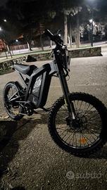 La bici è praticamente nuova con 300 km, con un anno di garanzia. Ha uno schermo a colori HC80 e si accende tramite chiave NFC. È dotata di luci complete: frecce anteriori e posteriori, stop e luci di posizione. Il motore è da 2000W, quindi molto potente. È presente anche un sistema di allarme con chiave NFC. Si può usare sia con pedalata assistita (che si può anche disattivare) sia in modalità completamente elettrica grazie all’acceleratore. Il telaio è in acciaio, con sella nera. La batteria è una Li-ion rimovibile da 48V 30Ah. L’autonomia arriva fino a 150/200 km con pedalata assistita, mentre in modalità completamente elettrica è di circa 90/100 km. Le ruote sono da 24” a raggi. La velocità massima è di 60 km/h. I freni sono idraulici ZOOM, molto affidabili. Può supportare fino a 150 kg di carico ed è resistente all’acqua con livello IP45. Infine, ha sospensioni anteriori a steli rovesciati e posteriori ad aria, quindi è comoda anche su terreni meno regolari. non valuto scambi con monopattini.