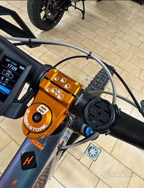 Telaio in carbonio, batteria da 750, freni Hope a 4 pistoni, dischi maggiorati, manubrio e pipa sterzo Burgtech, pedali Ht, gomme con mousse interna e liquido, 434 km, cambio 11 velocità, freni Xt, manubrio e pedali originali. Tutti i pezzi originali. Impianto frenante nuovo da 980€. Computer di bordo Garmin appena montato e mai usato.