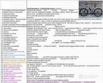 Mountain Bike elettrica E.Adventure World Dimension dalle prestazioni veramente professionali. Il manubrio è largo e ha manopole ergonomiche; la (piccola) regolazione in altezza è tramite spessori E' stato aggiunto un portapacchi posteriore. La forcella è dotata di un ammo Zoom con 80mm di escursione che lavora bene senza flessioni Il cambio è uno Shimano Acera preciso e veloce; si aziona con un comodo comando a doppia levetta La stabilità in marcia è ottima. La componentistica è di ottimo livello e l’assemblaggio è curato Gli pneumatici sono da 27,5” x 2.10” e sono tassellati: superano bene le piccole asperità ed hanno una buona tenuta sugli sterrati senza essere fastidiosamente rumorosi L’impianto frenante è a dischi (entrambi da 160mm) ed azionamento idraulico Tektro Auriga. Le leve sono molto morbide da azionare anche per frenate al massimo La frenata è assai buona e molto ben modulabile; lo spazio di fermata da 25 km/h è risultato solo di 3.45m. La centralina è integrata nel gruppo motore posteriore ed è perciò molto ben protetta e prevede 5 livelli di assistenza alla pedalata La batteria è da 36V 11.6Ah 420Wh prodotta dalla Phylion La sua estrazione è molto facile e il trasporto agevole; quando completamente scarica, si ricarica in circa 5 ore. Il motore è un posteriore Bafang/8Fun BBS01 da 36V 250W e 15 A massimi La spinta è potente ma erogata con progressività: non è mai aggressivo Per ottenere la massima spinta si deve però lasciar scendere il numero di pedalate al minuto L’avvio dell’assistenza avviene dopo 0.25 giri di pedale (90°) pari a 0.72m in prima marcia e la velocità massima supera decisamente i 26km/h.