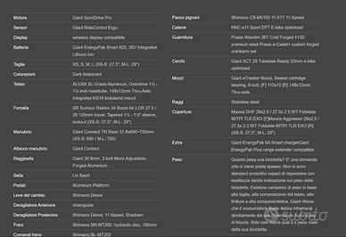E-BIKE MTB LIV (GIANT) VAL E+ PRO - TAGLIA XS Vendo e-bike MTB LIV (Giant) VAL E+ PRO - taglia XS colore Dark Iridescent praticamente nuova, ancora in garanzia. Viene fornita corredata del suo imballaggio e scatola originali, accessori in dotazione, batteria e carica batterie, nonché fattura di acquisto per garanzia. Acquistata presso rivenditore italiano. Inoltre cedo con la bici accessori acquistati a parte come da elenco a seguire: - Impianto di illuminazione comandabile da ride control - Pedali flat Giant - Manopole taclal double lock-on grip Giant - Forcellino di ricambio originale - Marsupio portaoggetti da sella - Camera d'aria di ricambio Continental - Copertoni estivi Hutchinson Cobra e Shield Ritchey Disponibile per qualsiasi informazione, prova e visione su Siena. Allego foto per caratteristiche tecniche (visibili anche sul sito Giant). MOTORE: Giant SyncDrive Pro BATTERIA: Giant EnergyPak Smart 625, 36V Integrated Lithium-Ion FORCELLA: SR Suntour Raidon 34 Boost Air LOR 27.5 120mm travel, Tapered 1 1/2 - 1 1/8 " steerer, lockout DERAGLIATORE POSTERIORE: Shimano Deore, 11-Speed, Shadow+ FRENI: Shimano BR-MT200, hydraulic disc, 180mm